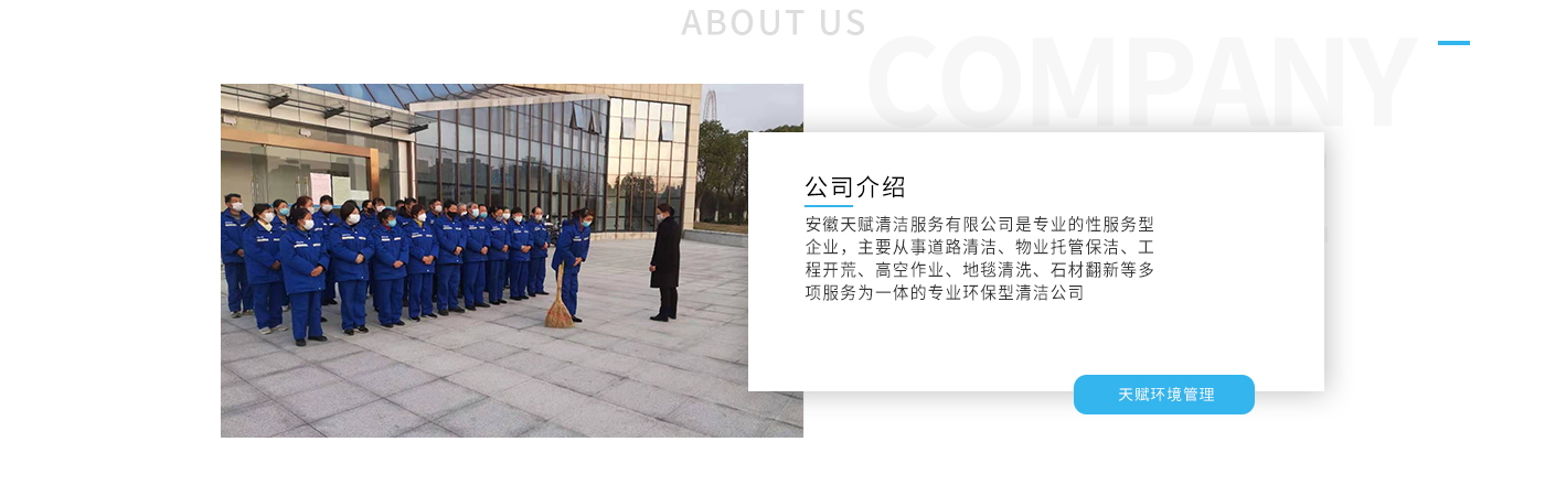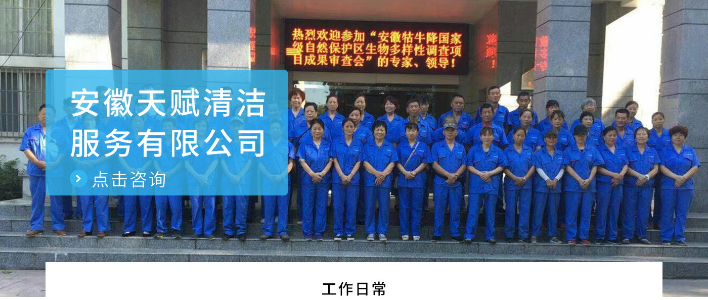 安徽天賦清潔服務(wù)有限公司是的服務(wù)型企業(yè),主要從事道路清潔、物業(yè)托管保潔、工程開(kāi)荒、高空作業(yè)、地毯清洗、石材翻新等多項(xiàng)服務(wù)為一體的環(huán)保型清潔公司。公司管理機(jī)制完善,清潔作業(yè)經(jīng)驗(yàn)豐富,擁有技術(shù)力量,嚴(yán)格實(shí)行崗前培訓(xùn)—崗中督查—上崗在培訓(xùn)的員工管理措施,憑著優(yōu)良的清潔質(zhì)量和嚴(yán)格的督查管理,為眾多企事業(yè)單位、醫(yī)院、酒店、廠區(qū)商場(chǎng)、物業(yè)、道路、學(xué)校、公園等提供后勤清潔服務(wù)。在業(yè)內(nèi)擁有良好的口碑。工作人員,服務(wù)態(tài)度優(yōu),竭力為客戶(hù)提供好的保潔服務(wù)。安徽天賦清潔服務(wù)有限公司:致力于長(zhǎng)期合作關(guān)系,提高服務(wù)質(zhì)量,提供高標(biāo)準(zhǔn)的清潔服務(wù)。公司的經(jīng)營(yíng)理念:為營(yíng)造一個(gè)更清潔、亮麗的生活和工作環(huán)境而努力!“誠(chéng)信”是公司成功保證。“客戶(hù)至上,信譽(yù)為首”是公司宗旨。高標(biāo)準(zhǔn)提供服務(wù),維護(hù)客戶(hù)利益、形象,是我始終不渝的目標(biāo)。